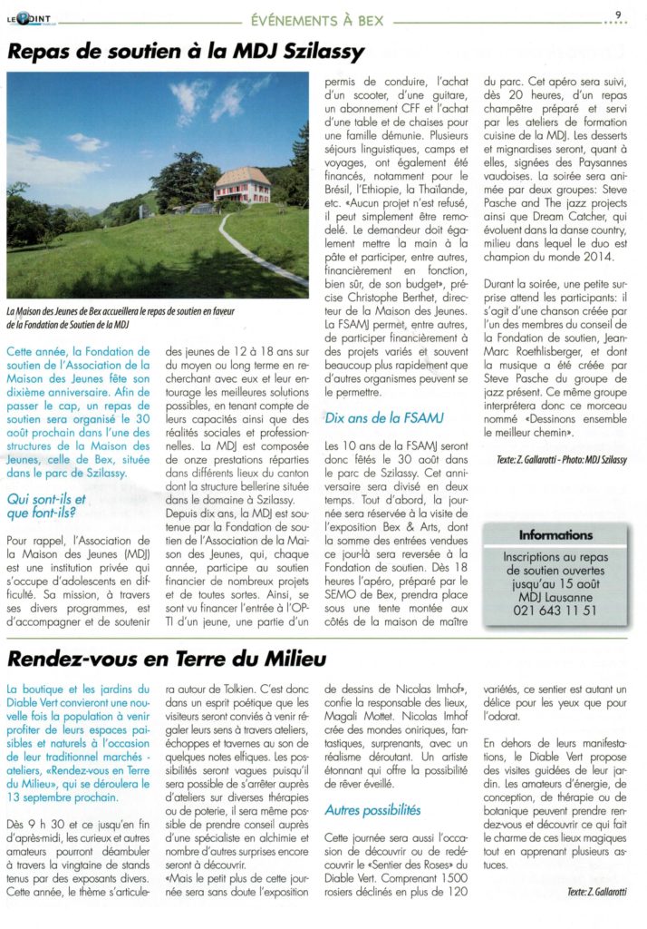 Cet apéro sera suivi, dès 20 heures, d’un repas champêtre préparé et servi par les ateliers de formation cuisine de la MDJ. Les desserts et mignardises seront, quant à elles, signées des Paysannes vaudoises. La soirée sera animée par deux groupes: Steve Pasche and The jazz projects ainsi que Dream Catcher, qui évoluent dans la danse country, milieu dans lequel le duo est champion du monde 2014.